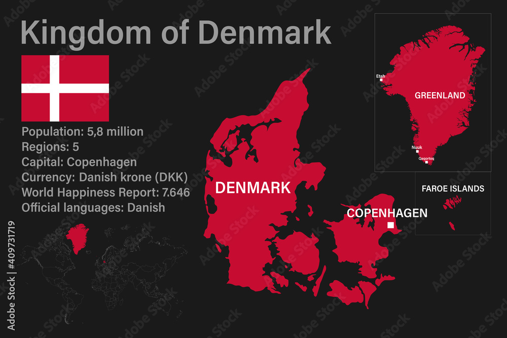 Highly detailed Kingdom of Denmark map with flag, capital and